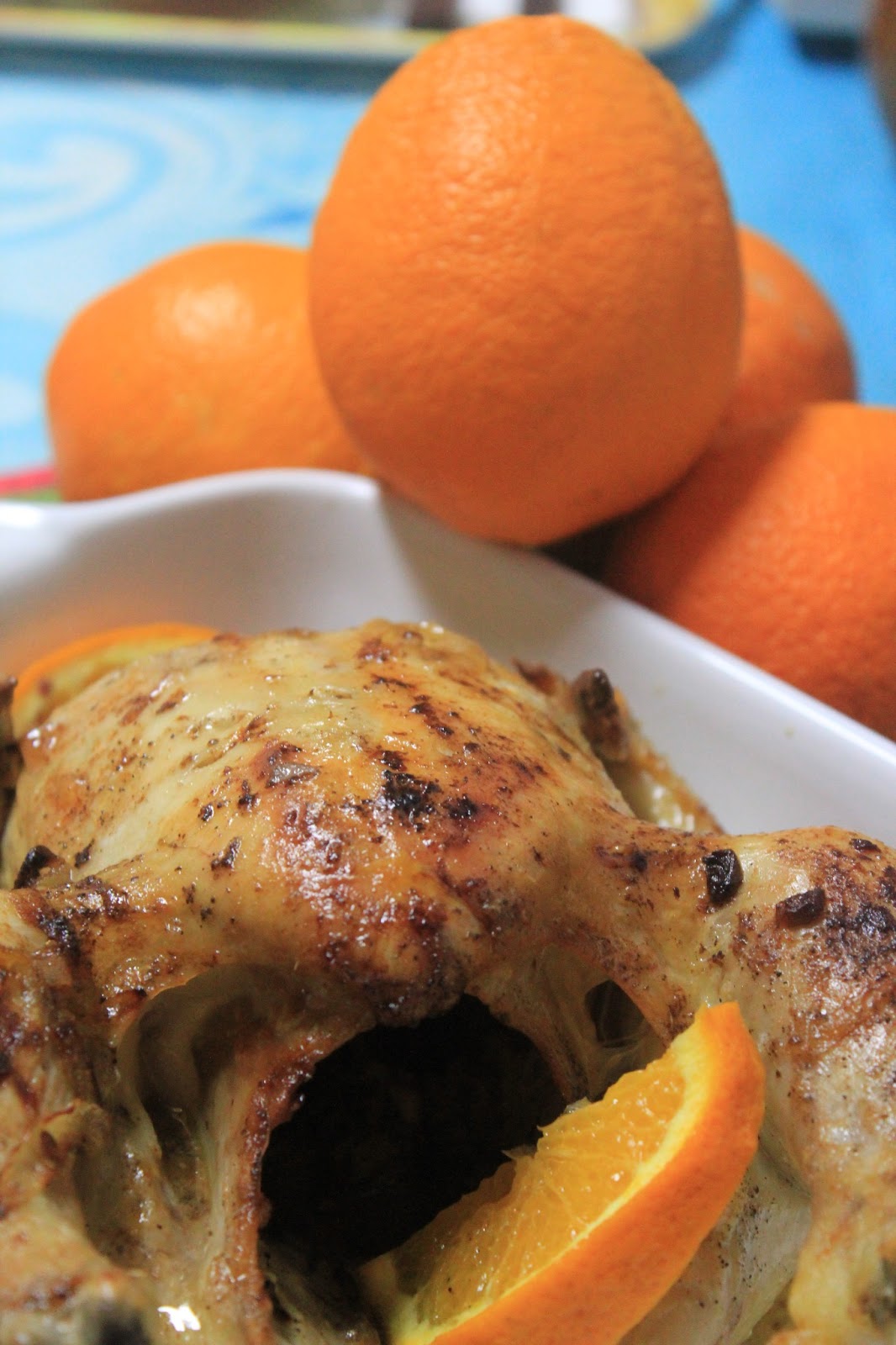 Regue o frango com o resto de sumo da metade de laranja de onde retirou o sumo para o tempero e coloque as rodelas da outra metade pelo tabuleiro e uma rodela dentro do seu frango.