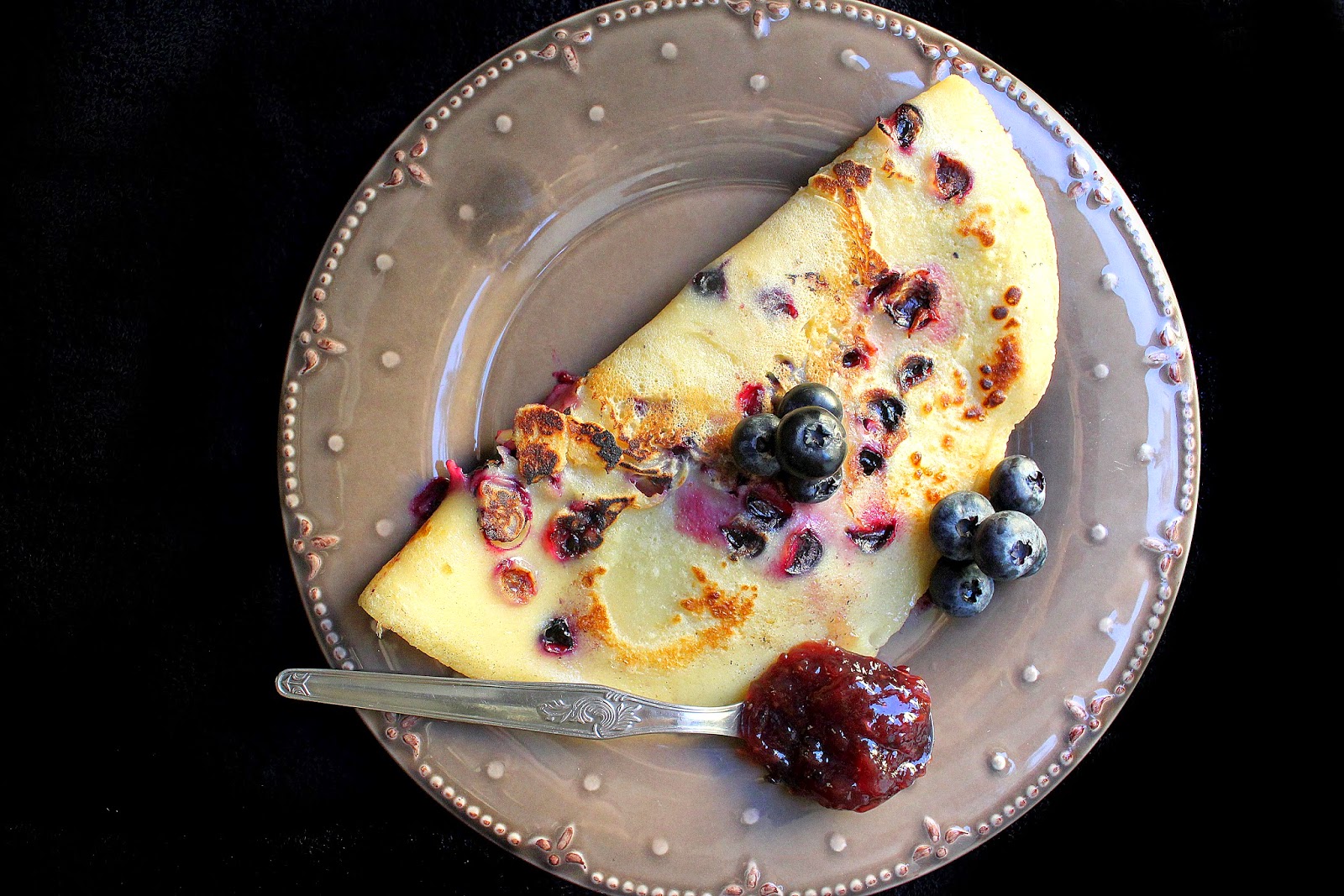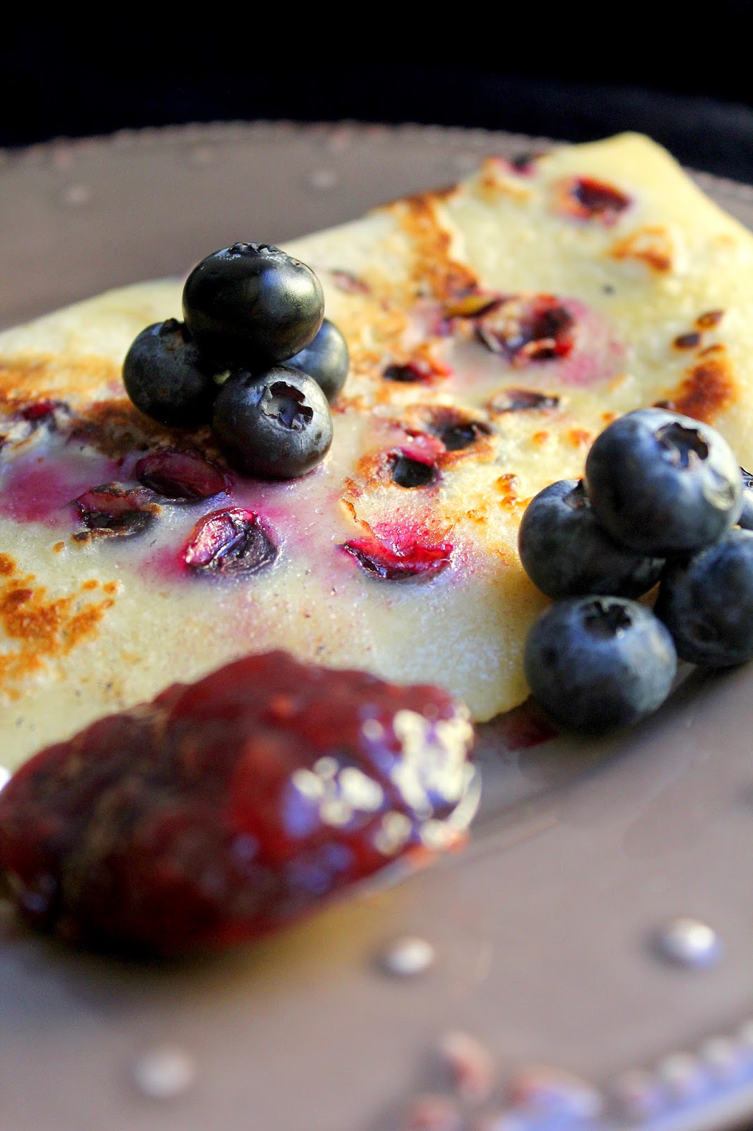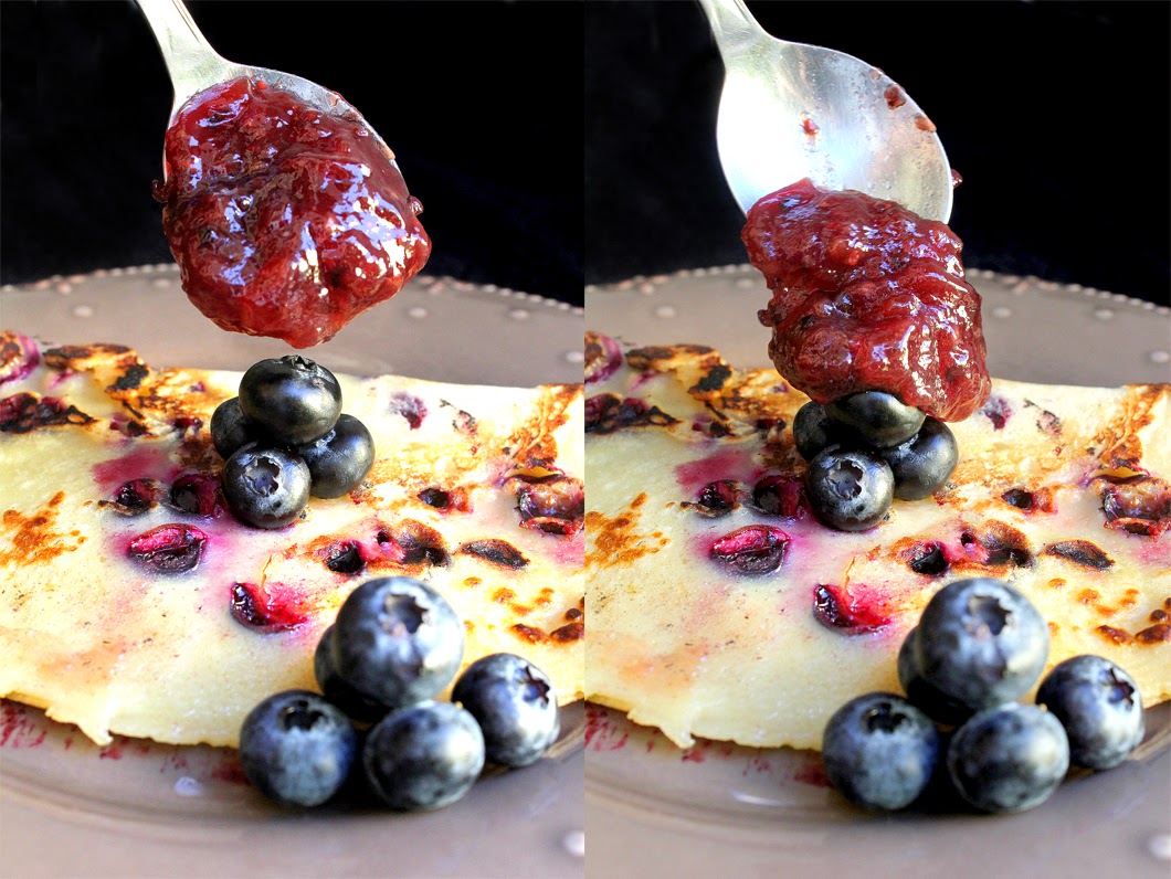 Chegando a casa ela esteve a ajudar-me e cortou os mirtilos, desejo realizado, mas fiz as panquecas mais finas que o habitual e dobrei, ela deu o nome de omeletes, achei engraçado, e assim ficou :)