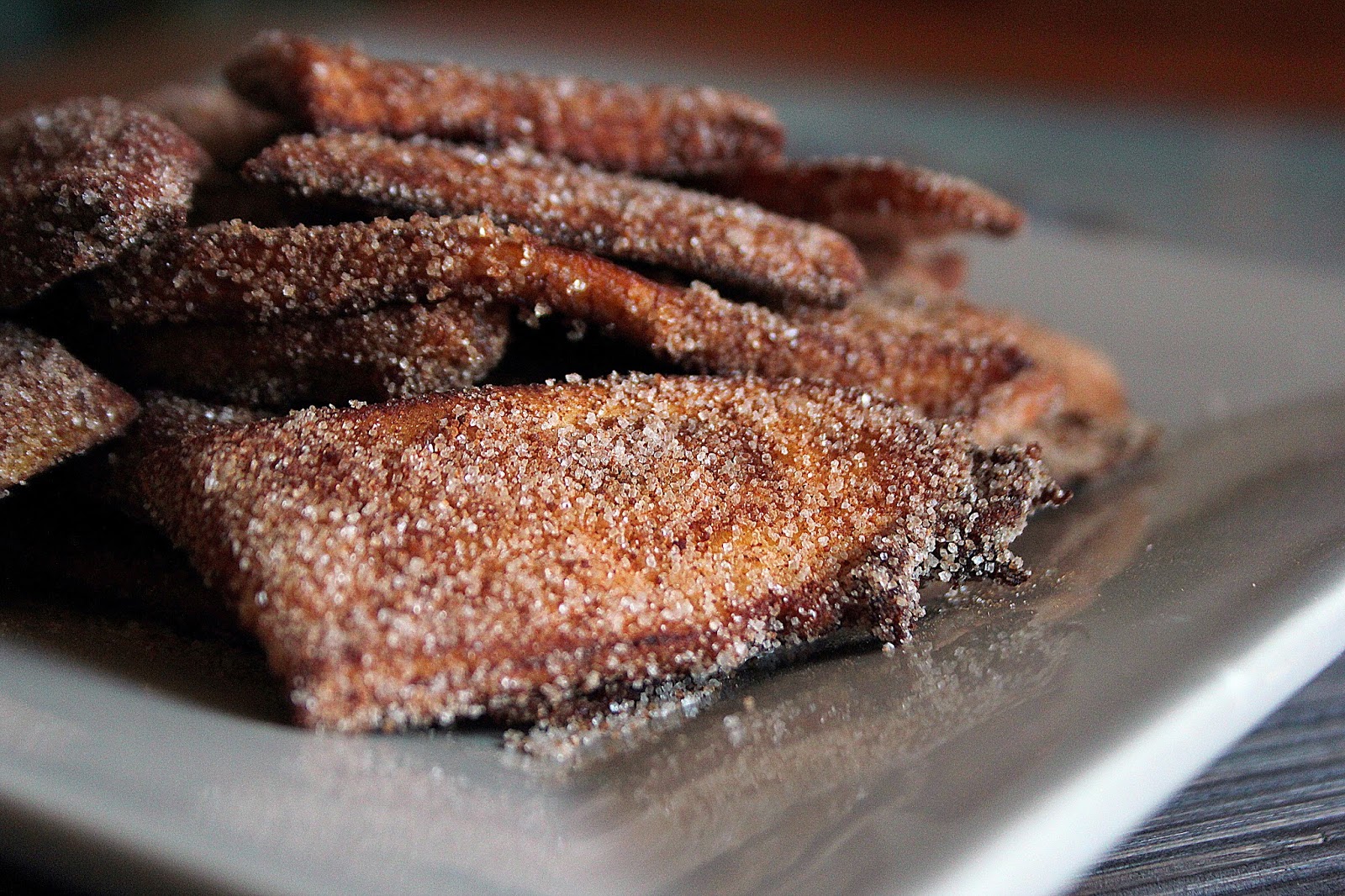 Retire e passe cada fatia por açúcar e canela.