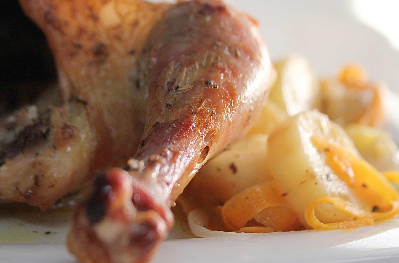 No almofariz coloque o dente de alho picado, o tomilho, as colheres de azeite e sal suficiente para o seu frango, forme uma paste e espalho muito bem pelo seu frango. Num tabuleiro de ir ao forno, coloque 1 fio de azeite, a metade da cebola cortada em meias luas e a cenoura cortada em Juliana.