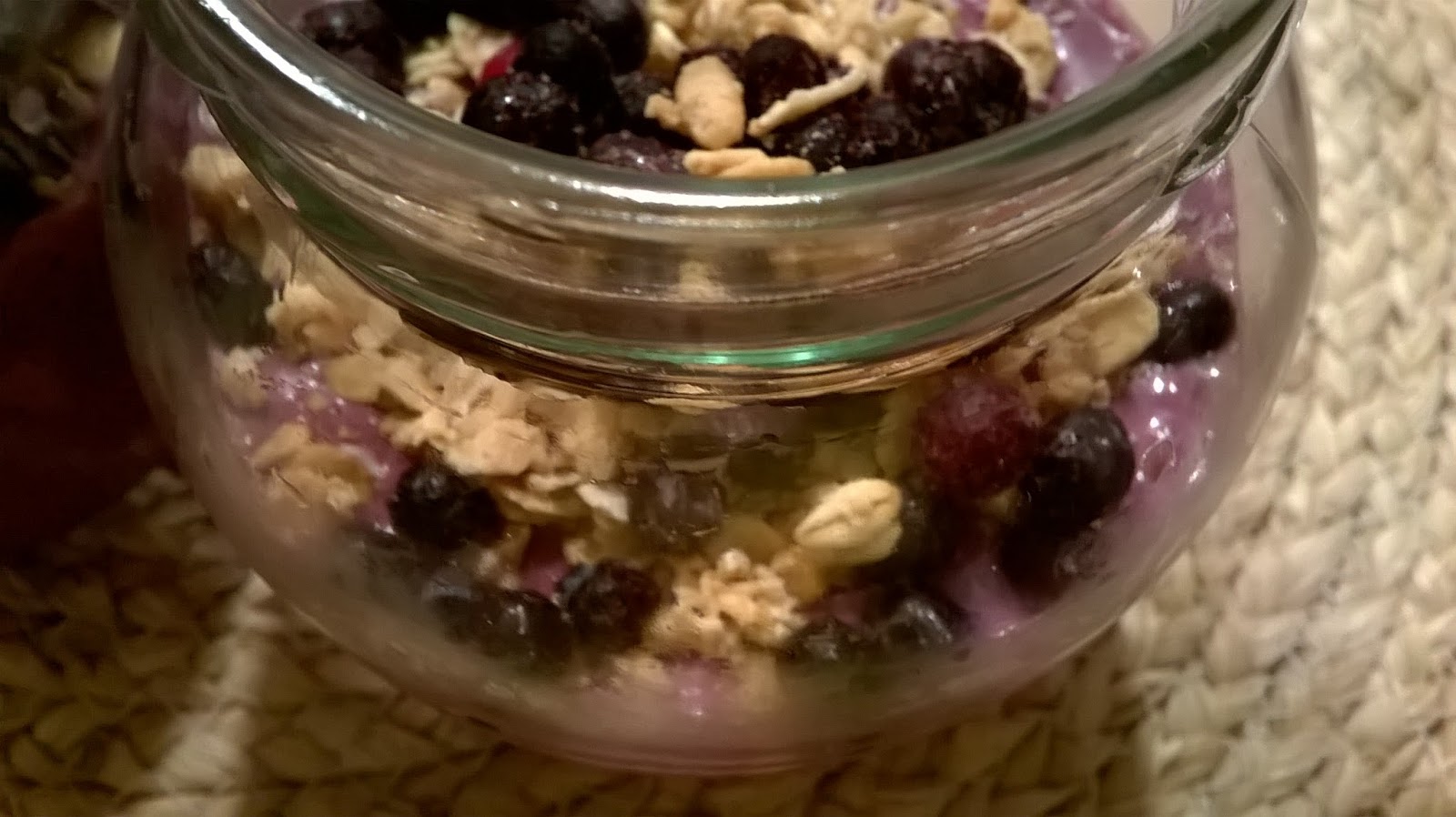 No fundo de cada frasco coloque um pouco de muesli como base, em seguida divida o preparado de mirtilos pelos 2 frascos. no topo coloque mais um pouco de muesli e alguns mirtilos. Tape os frascos e coloque no frio até á manhã seguinte para o seu pequeno almoço.